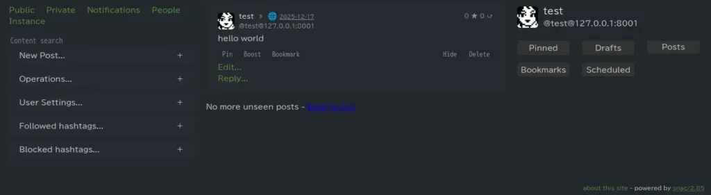 <!DOCTYPE html><html><head><meta name="viewport" content="width=device-width, initial-scale=1"/><link rel="icon" type="image/x-icon" href="https://%host%/favicon.ico"/><style>*{color-scheme:light dark}body{margin:auto;max-width:50em}</style><title>Welcome to %host%</title></head><body><p><b>%host%</b> is a <a href="https://en.wikipedia.org/wiki/Fediverse">Fediverse</a> instance that uses the <a href="https://en.wikipedia.org/wiki/ActivityPub">ActivityPub</a> protocol. In other words, users at this host can communicate with people that use software like Mastodon, Pleroma, Friendica, etc. all around the world.</p><p>This server runs the <a href="https://comam.es/what-is-snac">snac</a> software and there is no automatic sign-up process.</p><p>The following users are part of this community:</p>%userlist%<p>This site is powered by <abbr title="Social Networks Are Crap">snac</abbr>.</p></body></html>例えば日本語にしたり,ユーザーリストを隠したりといったカスタマイズが出来ます.このhtml ファイルを保存した時点で反映されます.